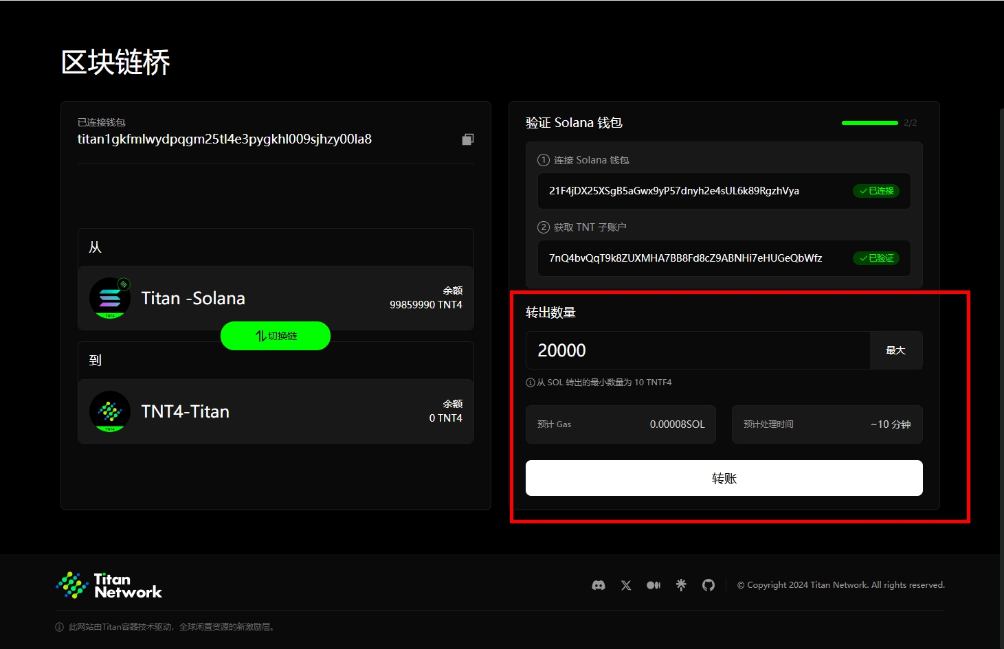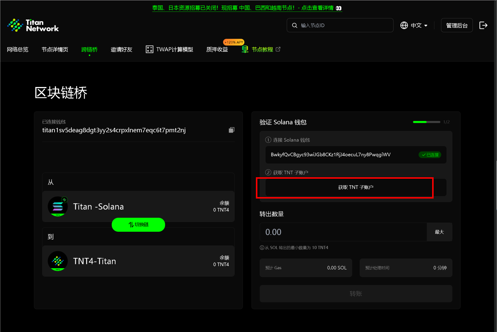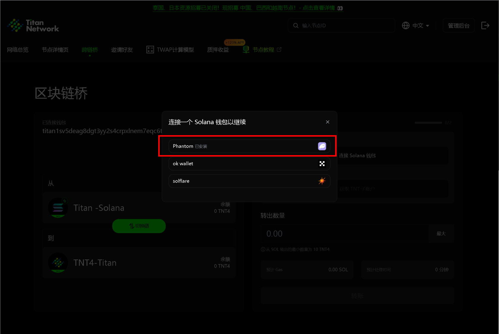 ### 将TNT4代币从Solana网络跨链转账至Titan链功能已经上线