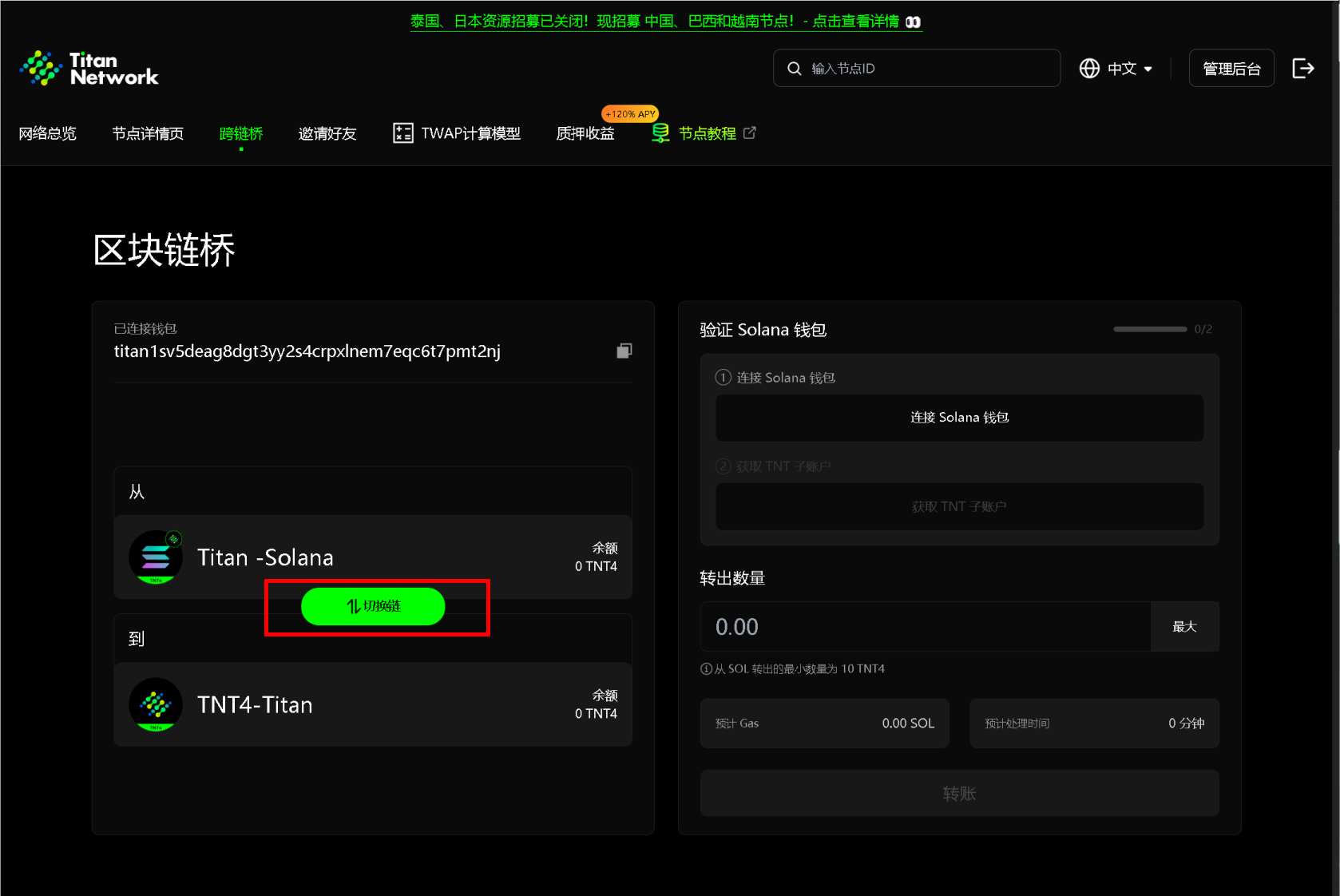 * 默认为Titan——>Solana，点击“切换链”按钮，切换为“Solana——>Titan”