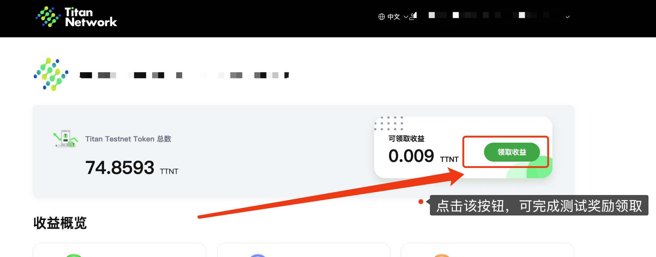<figure><img src="https://3822791205-files.gitbook.io/~/files/v0/b/gitbook-x-prod.appspot.com/o/spaces%2FrZQtAKIIsvAQP0E9RumD%2Fuploads%2Fk9b7tD40wbdMSD1AGZey%2Fimage.png?alt=media&#x26;token=9da9ce9d-e969-4345-bd2e-eb2bab0faeda" alt=""><figcaption><p>如果您已经完成质押操作并产生收益，可以通过点击此按钮领取赚取到的测试质押奖励。这样您就可以定期获取质押代币所带来的收益。</p></figcaption></figure>